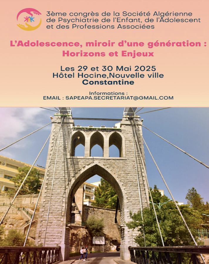 3ème congrès de la Société Algérienne de Psychiatrie de l'Enfant de l'Adolescent et des professions Associée Les 29 et 30 Mai 2025 📍Hôtel Hocine Nouvelle ville Constantine