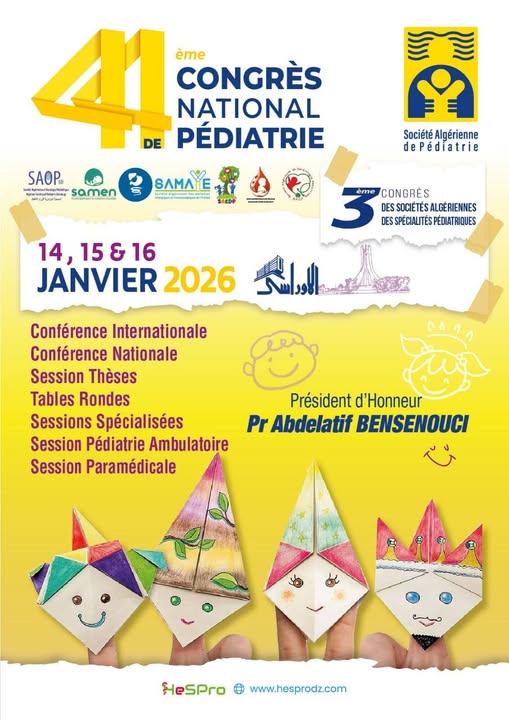 44émes CONGRÈS NATIONAL DE PÉDIATRIE & 3éme CONGRÈS DES SOCIÉTÉS ALGÉRIENNES DES SPÉCIALITÉS PÉDIATRIQUES du 4 , 15 & 16 JANVIER 2026 📌HÔTEL EL AURASSI