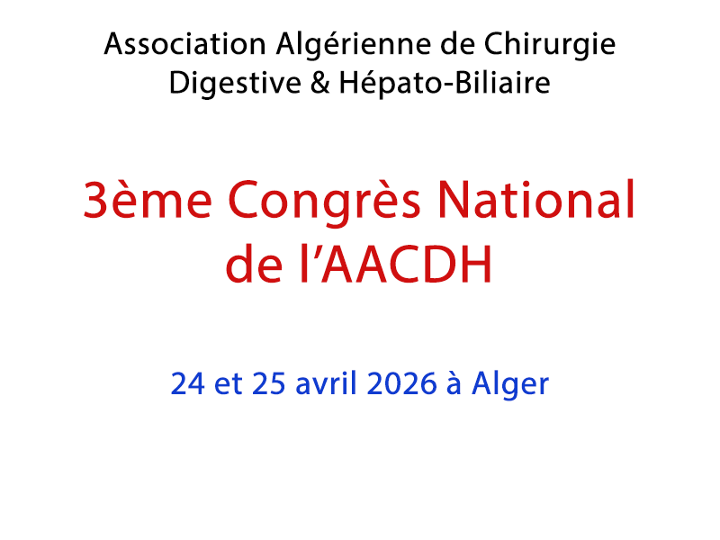 3ᵉ congrès national de L’Association Algérienne de Chirurgie Digestive et Hépatobiliaire (AACDH) qui se déroulera les 24 et 25 avril 2026 à 📌L'Hôtel El Aurassi , Alger.
