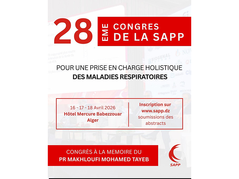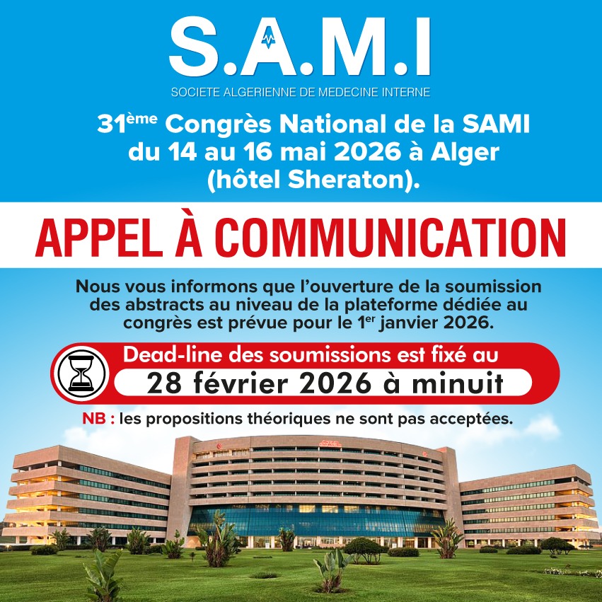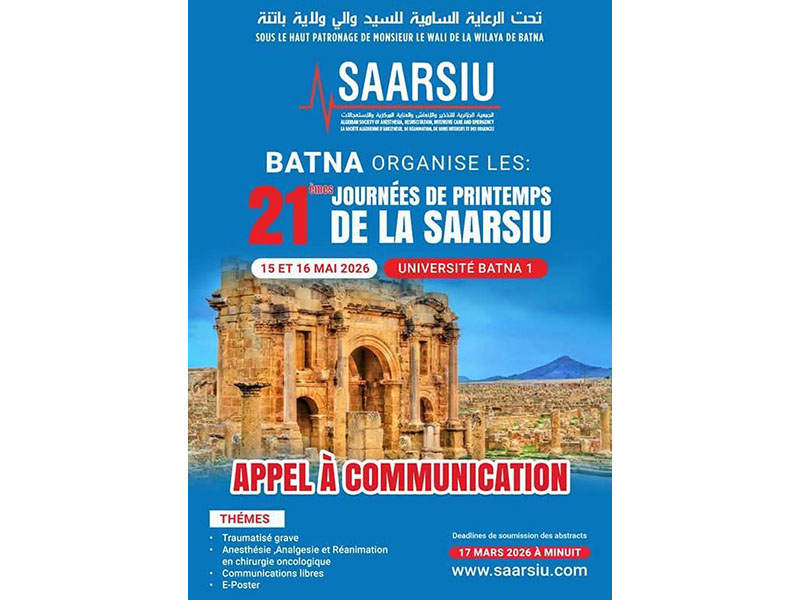La Société Algérienne d'Anesthésie, de Réanimation, de Soins Intensifs et des Urgences (SAARSIU), organise les 21 émes journées de printemps les 15 et 16 mai 2026 📌à Batna (Université BATNA 1)