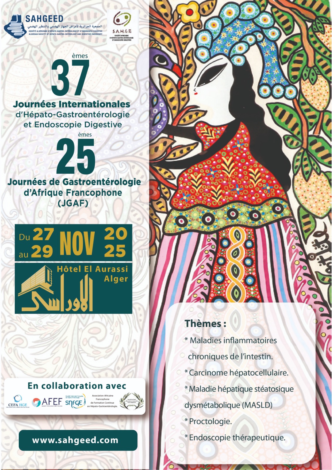 37èmes Journées internationales, & 25èmes Journées de Gastroentérologie d’Afrique Francophone (JGAF) du 27 au 29 novembre 2025, 📍hôtel El Aurassi à Alger,