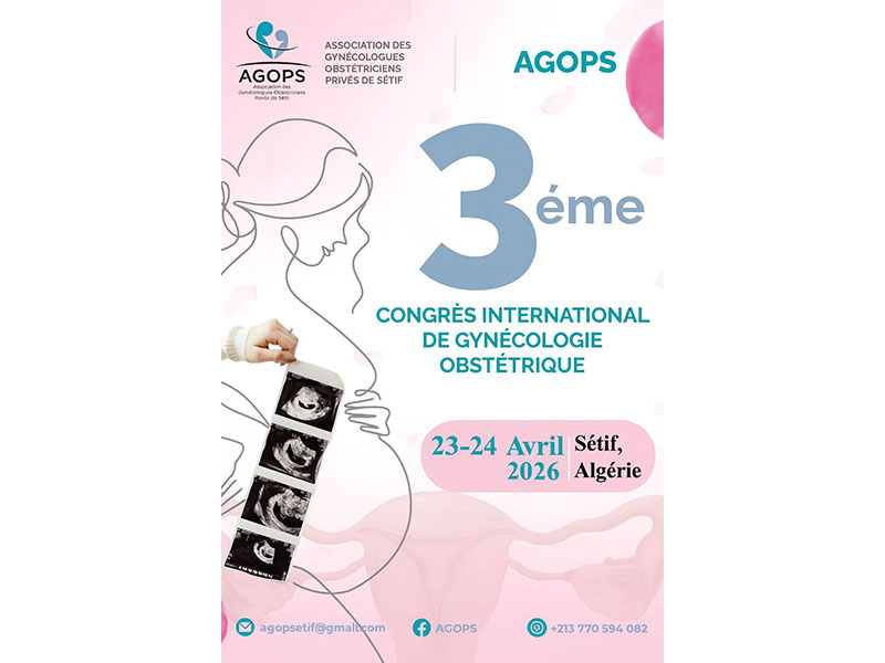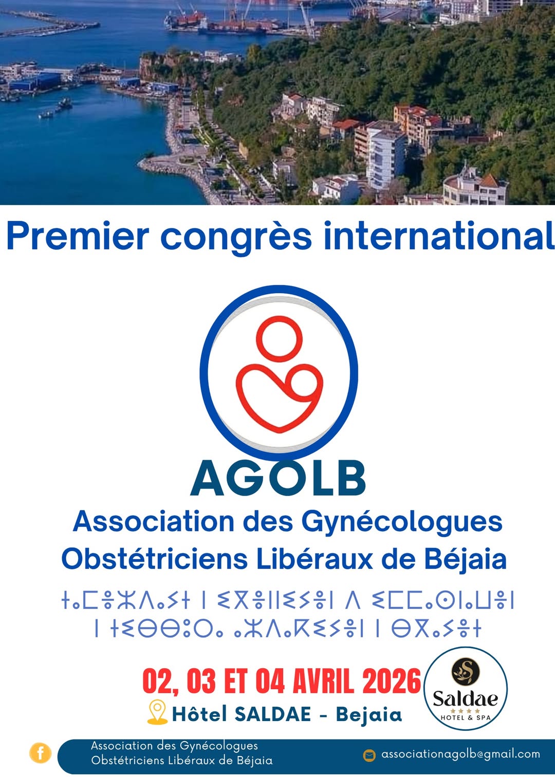 1er Congrès International de l’Association des Gynécologues Obstétriciens Libéraux de Béjaia (AGOLB) du 02, 03 et 04 avril 2026 📌 Hôtel SALDAE – Béjaia